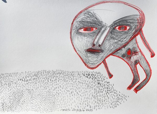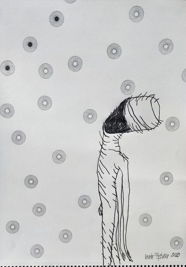 I am perplexed as I struggle with the meaning of us. An unsettled, emotionally disturbed figure sits staring at us in an emotionally oblivious environment created from technically precise particles whose existence is unknown. Simple decorations? Expanding particles of Black Matter? God? Or sudden glitches in the hologram universe?